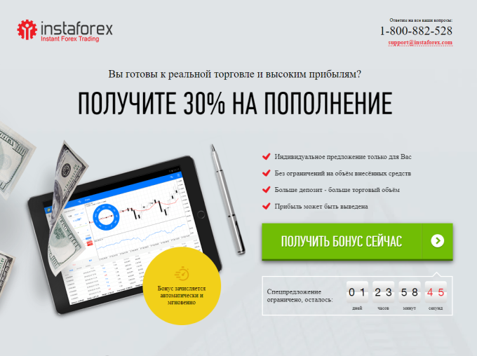 ИнстаФорекс мижозлари учун янгилоқ таклиф. Сиз фойдаланишчи сифатида тасдиқланган реал тижорат хисобини очиб, тўлов миқдорига +30%ни қўшиш имконияти берилади. Оширилган депозит сизга катта амалларни бажариш имкониятини беради. Бонус бўшатилган бора ёзилиши шарқлилиги йўқ.