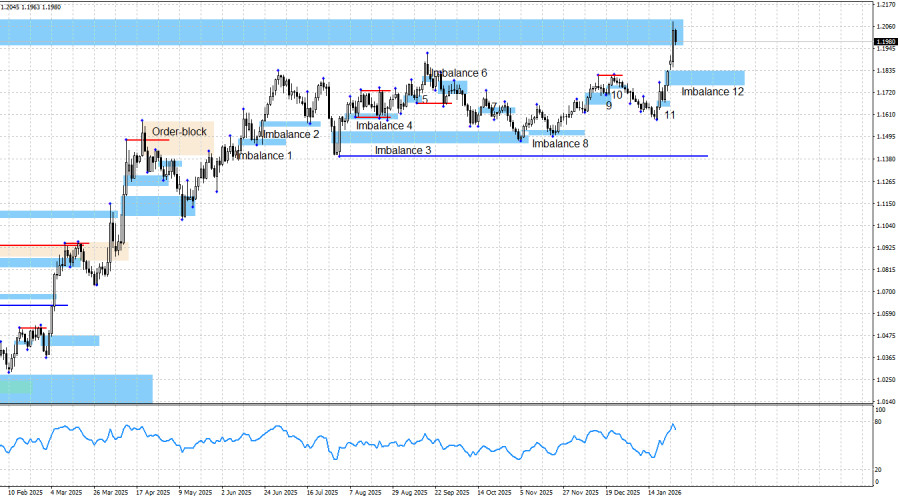 Пара EUR/USD продолжает процесс роста. Как я и предполагал. На «бычьем» тренде основное внимание трейдеров должно быть направлено на «бычьи» паттерны и сигналы на покупку. На прошлой неделе был образован очередной «бычий» имбаланс 11 и практически сразу же – сигнал на покупку в виде реакции на этот паттерн. Таким образом, трейдеры имели очередную прекрасную возможность для открытия сделок, которые сейчас находятся в прибыли около 250 пипсов. Недельный «медвежий» имбаланс достигнут, от него может последовать небольшая реакция цены, что может быть
